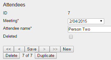 Copy the "meeting_type" config table created in step 7 (Create reference data), and rename "meeting_type" to "attendee". This, by itself, would be sufficient to create a list of people's names (multiple records, each with a single name), but there would be nothing linking each name back to the meeting. To rectify this, identify a field in the "meeting" table which is likely to uniquely identify it - probably the "date_box".