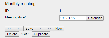 <doc> <page heading="Monthly meeting"> <form name="meeting" showId="y" showNavButtons="y" showSaveButton="y" showNewButton="y" showDeleteButton="y" showDuplicateButton="y" showXofXX="y" initialId="max" useRules="n" previewColumns="~~" autoPreview="n"> <element name="date_box" type="input" validate="date" label="Date" mandatory="y" default="" maxSize="10" permission="whhhhhhhhh"/> <element name="location" type="input" validate="sentence" label="Location" mandatory="y" default="Public hall" maxSize="45" permission="whhhhhhhhh"/> </form> </doc>