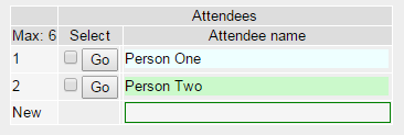 New attendees can be added by typing the name directly into the input box in the "Attendees" and clicking "Save". Text fields can also be edited directly by typing into the grid.