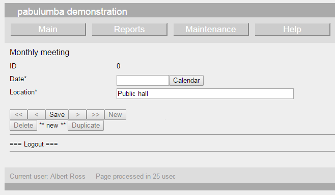 Notice how the ID is "0" when a new record is created. The "XofXX" field displays "** new **", and the navigation and most other buttons are also disabled. The default value of "Public hall" is automatically inserted into the Location record.