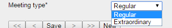 <element name="meeting_type" type="select" label="Meeting type" mandatory="n" source="Regular,Extraordinary" permission="whhhhhhhhh" javascript=""/>