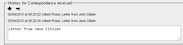 <element name="correspondence" type="textarea" validate="sentence" label="Correspondence received" default="" rows="3" cols="80" keepHistory="n" showHistory="n" mandatory="n" maxSize="1000" permission="whhhhhhhhh"/>